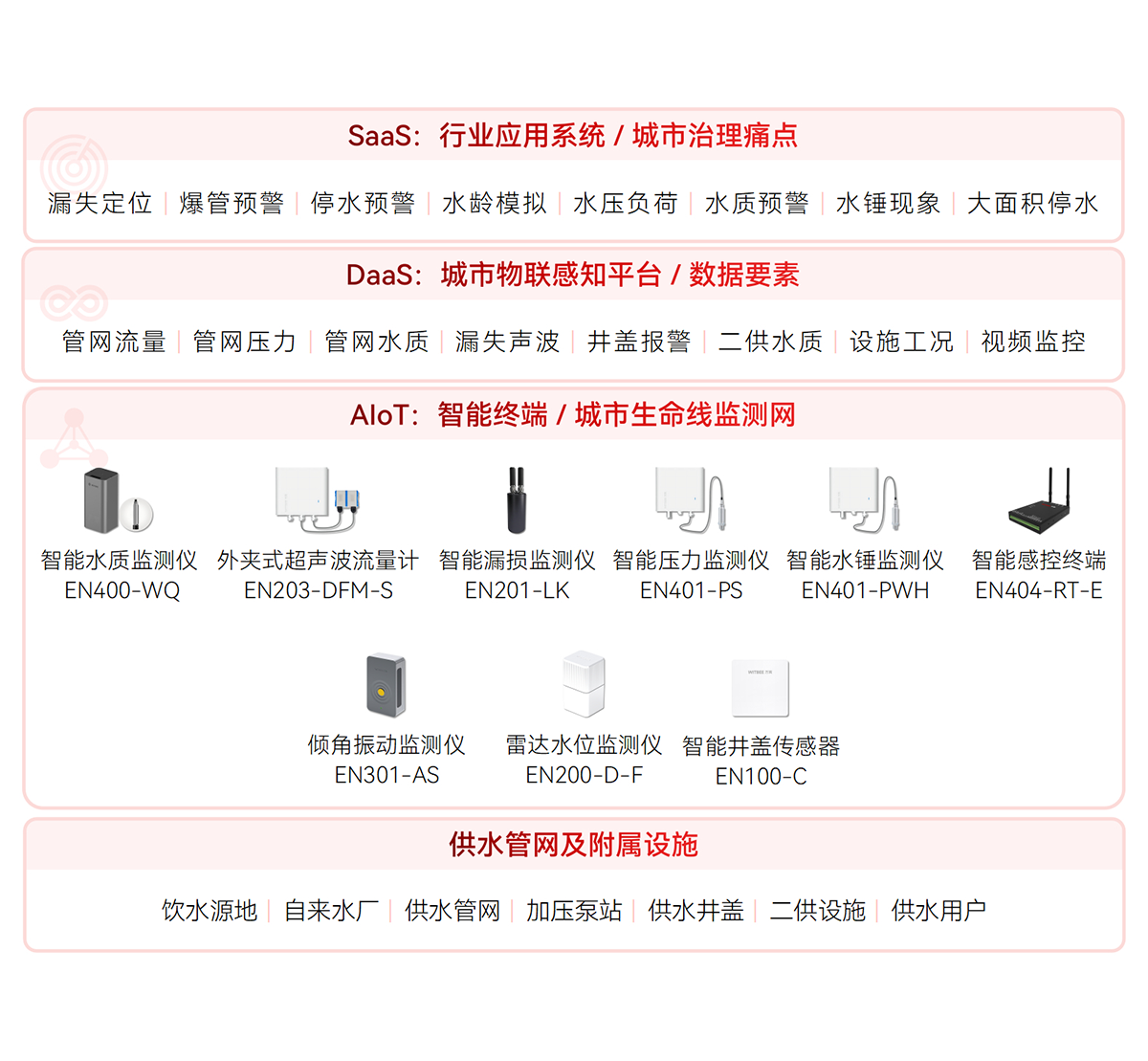 對(duì)供水管網(wǎng)設(shè)施及水質(zhì)提供實(shí)時(shí)監(jiān)測(cè),通過(guò)各類(lèi)智能監(jiān)測(cè)終端保障供水壓力平衡、流量穩(wěn)定和供水安全,及時(shí)發(fā)現(xiàn)爆管并預(yù)警,避免大面積城市停水事故發(fā)生,為管網(wǎng)爆管預(yù)警分析、用水趨勢(shì)分析和泄漏量預(yù)警分析提供數(shù)據(jù)支撐。